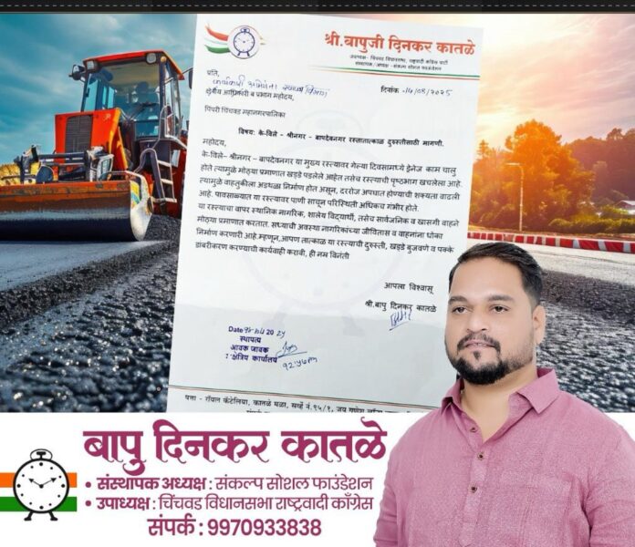 पिंपरी चिंचवड शहरातील किवळे परिसरातील के विले – श्रीनगर – बापदेव नगर हा रस्ता तात्काळ दुरुस्त करावा अशी मागणी राष्ट्रवादी पक्षाचे चिंचवड विधानसभेचे उपाध्यक्ष बापू कातळे यांनी ब प्रभाग कार्यकारी अभियंता यांच्याकडे केली आहे.
