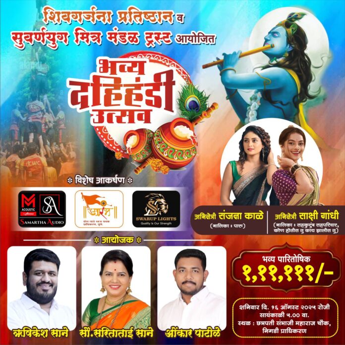 तरी सदर भव्य दहीहंडी उत्सवात निगडी प्राधिकरण परिसरातील नागरिकांनी मोठ्या संख्येने उपस्थित राहत दहीहंडी उत्सवाचा आनंद लुटावा असे आवाहन सौ. सरिता ताई साने, ऋषिकेश साने, व ओंकार पाटोळे तसेच शिवगर्जना प्रतिष्ठान व सुवर्णयुग मित्र मंडळ ट्रस्ट वतीने करण्यात आले आहे.