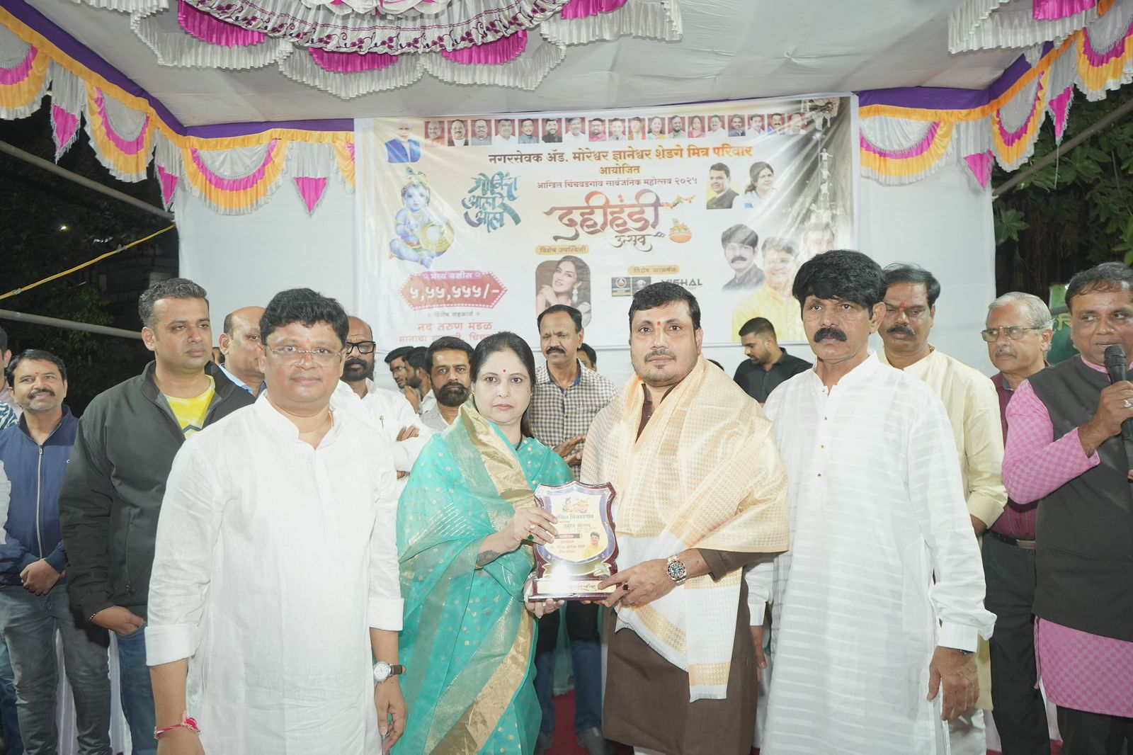 दहिहंडी महोत्सवाचे संयोजक अॅड. मोरेश्वर शेडगे यांच्या वतीने स्मृतीचिन्ह व 5,55,555 रुपयांचे बक्षीस भाजपा शहराध्यक्ष शत्रुघ्न बापू काटे, आमदार अमितजी गोरखे, आमदार उमाताई खापरे, माजी आमदार श्रीमती अश्विनीताई जगताप, राष्ट्रीय श्रमिक आघाडीचे अध्यक्ष यशवंतभाऊ भोसले व भाजपा जेष्ठ नेते पै.ज्ञानेश्वर आप्पा शेडगे यांच्या हस्ते गोविंदा पथकास देण्यात आले.