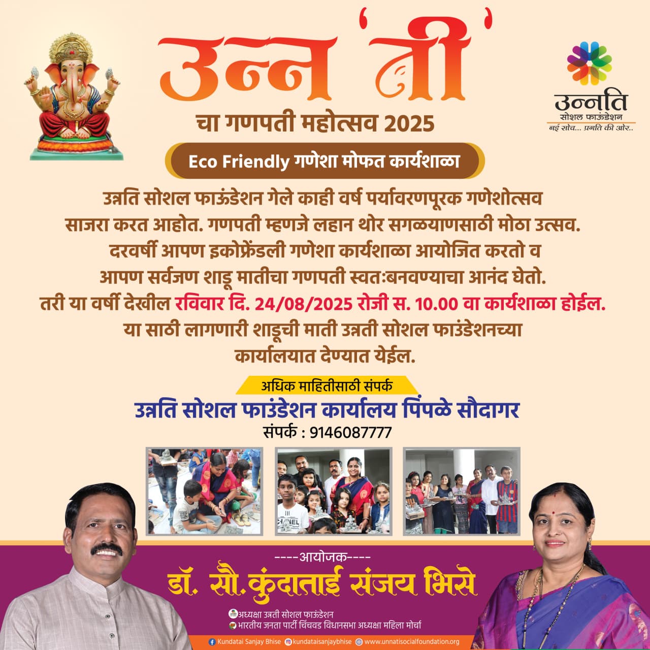 उन्नती सोशल फाउंडेशन यांच्यावतीने उन्न ‘ती’चा गणपती महोत्सव 2025 यानिमित्त इको फ्रेंडली गणेशा मोफत कार्यशाळा आयोजित करण्यात आली आहे. सदर कार्यशाळा रविवार (दि. 24 ऑगस्ट 2025 ) रोजी सकाळी 10 वाजता आयोजले गेले आहे, अशी माहिती उन्नती सोशल फाउंडेशनच्या अध्यक्ष तथा भाजपच्या चिंचवड विधानसभा महिला मोर्चा अध्यक्ष डॉ. कुंदाताई भिसे यांनी दिली आहे.