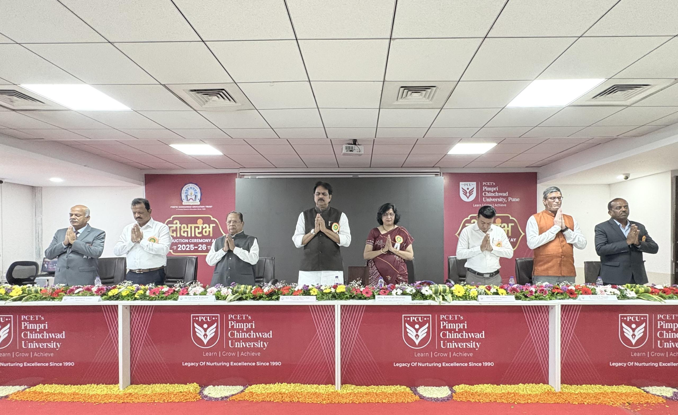 पिंपरी चिंचवड एज्युकेशन ट्रस्ट पीसीईटी संचालित पिंपरी चिंचवड विद्यापीठ, साते मावळ येथे शैक्षणिक वर्ष २०२५-२६ मध्ये प्रवेश घेतलेल्या विद्यार्थी आणि त्यांच्या पालकांसाठी ‘दीक्षारंभ’ समारंभाचे आयोजन सोमवारी (२५ ऑगस्ट) करण्यात आले होते. यावेळी पीसीईटीचे अध्यक्ष ज्ञानेश्वर लांडगे, विश्वस्त तथा पीसीयुचे कुलपती हर्षवर्धन पाटील, उद्योजक नरेंद्र लांडगे, धनंजय काळभोर, प्रभारी कुलगुरू डॉ. गोविंद कुलकर्णी, प्र-कुलगुरू डॉ. सुदीप थेपडे, स्कूल ऑफ इंजिनीअरिंग अँड टेक्नॉलॉजीचे विभाग प्रमुख डॉ. रामदास बिरादार, अभियांत्रिकी विभाग अधिष्ठाता डॉ. विजय पाटील आदी उपस्थित होते.