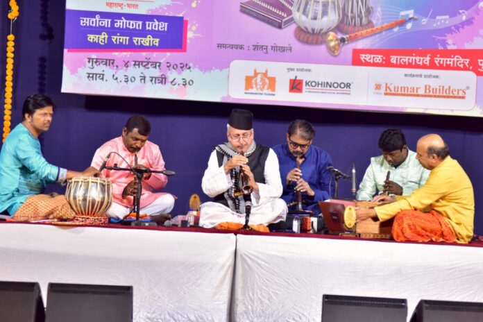 पं. शिवकुमार शर्मा यांचे शिष्य डाॅ. शंतनु गोखले यांच्या संतूरवादनाने पूर्वार्धात रंग भरले. गणेशोत्सवाचे उत्साही वातावरण लक्षात घेऊन डॉ. शंतनु यांनी वादनाचा आरंभ ‘एकदंताय वक्रतुंडाय श्रीगणेशाय धीमहि’ या लोकप्रिय भक्तीरचनेच्या सादरीकरणाने केला. त्यानंतर गुरू पं. शिवकुमार शर्मा यांचे आवडते संगीतकार मदनमोहन आणि ओ. पी. नय्यर यांच्या स्मृतींना अभिवादन म्हणून ‘लग जा गले’, ‘दिवाना हुवा बादल’ या गाजलेल्या गीतांचा मिडले सादर केला. संगीतकार शिव हरी यांची ‘सिलसिला’ चित्रपटातील ‘देखा एक ख्वाब तो ये सिलसिले हुवे’ ही रचनाही त्यांनी ऐकवली. त्यानंतर डॉ. शंतनु यांनी राग बागेश्री सादर केला. मोजक्या वेळात आलाप, जोड करून त्यांनी झपताल आणि त्रितालातील रचना पेश केल्या. पं. रामदास पळसुले यांचे शिष्य हेमंत जोशी यांनी त्यांना अनुरूप तबलासाथ केली.