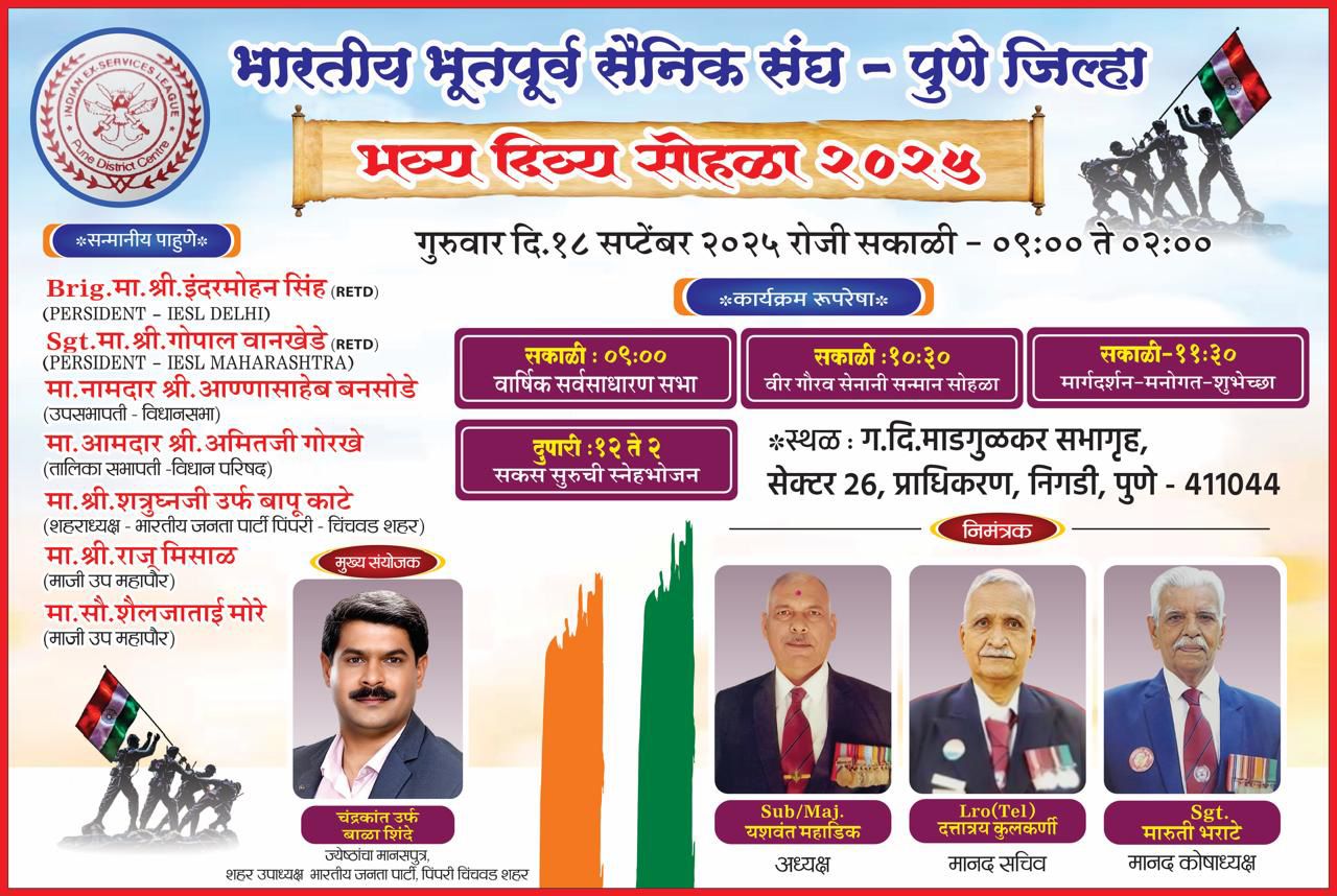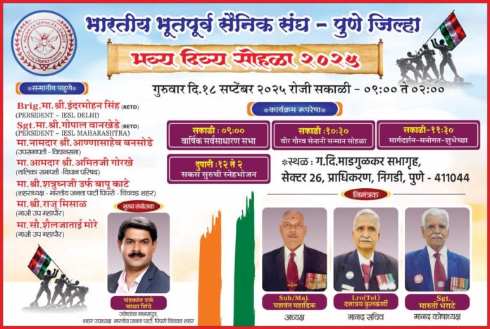 गुरुवार, दिनांक १८ सप्टेंबर २०२५ रोजी सकाळी ९ ते दुपारी २ या कालावधीत भारतीय भूतपूर्व सैनिक संघ – पुणे जिल्हा यांच्या वतीने वार्षिक सर्वसाधारण सभेत वीर गौरव सेनानी सन्मान सोहळ्याचे आयोजन करण्यात आले आहे.