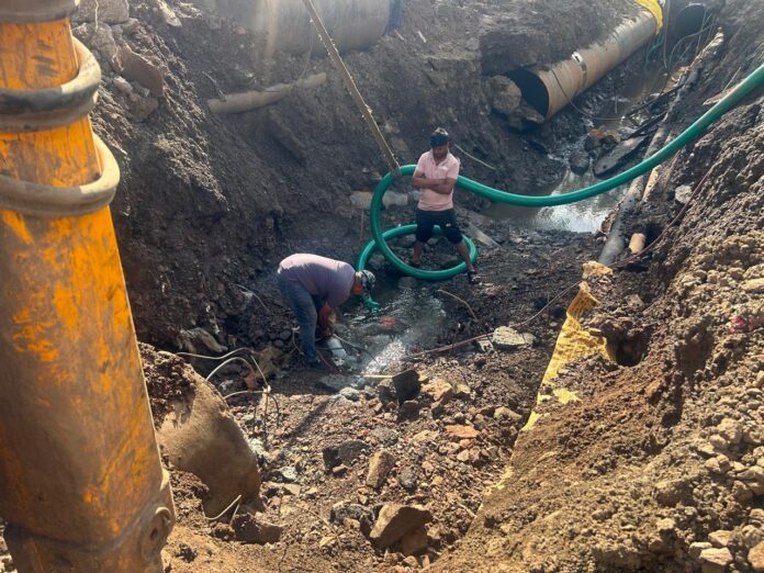 जलवाहिनी दुरुस्तीचे काम युद्धपातळीवर सुरू असून पाणीपुरवठा लवकरात लवकर नियमित करण्यासाठी पाणीपुरवठा विभाग प्रयत्नशील आहे. नागरिकांनी पाणी जपून वापरावे.