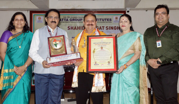 शहीद भगतसिंह यांच्या जयंतीनिमित्त सूर्यदत्त एज्युकेशन फाउंडेशनतर्फे आयोजित विशेष कार्यक्रमात प्रा. डॉ. संजय बी. चोरडिया बोलत होते. ‘सूर्यदत्त’च्या बावधन कॅम्पसमध्ये झालेल्या कार्यक्रमात राष्ट्रवादी काँग्रेस (शरदचंद्र पवार) पार्टीचे माजी शहराध्यक्ष व नगरसेवक रवींद्र माळवदकर यांना ‘सूर्यदत्त सूर्यभूषण राष्ट्रीय पुरस्कार २०२५’ प्रदान करण्यात आला. मानपत्र, सुवर्णपदक व सूर्यदत्त स्कार्फ असे पुरस्काराचे स्वरूप होते. सूर्यदत्त एज्युकेशन फाउंडेशनच्या उपाध्यक्षा सुषमा चोरडिया, सहायक उपाध्यक्ष स्नेहल नवालखा, अधिष्ठाता प्रा. डॉ. प्रतीक्षा वाबळे, मुख्य कार्यपालन अधिकारी अक्षित कुशल यांच्यासह विद्यार्थी, शिक्षक-शिक्षकेतर कर्मचारी मोठ्या संख्येने उपस्थित होते.