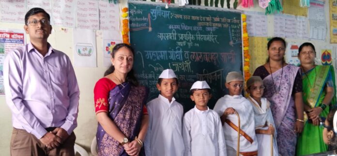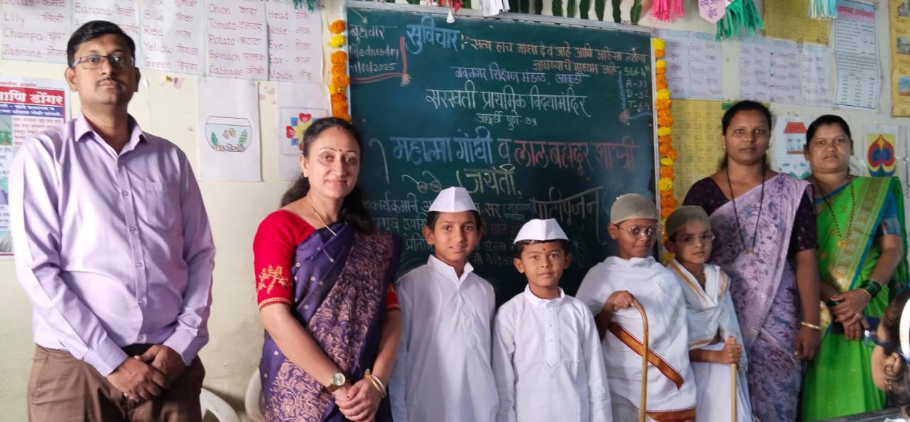 नवनगर शिक्षण मंडळ आकुर्डी संचलित श्री सरस्वती प्राथमिक विद्यामंदिर आकुर्डी या शाळेमध्ये महात्मा गांधीजी जयंती, लाल बहादूर शास्त्री जयंती तसेच विजयादशमी शुभेच्छा समारंभ आनंदी उत्साही वातावरणामध्ये संपन्न झाला.या कार्यक्रमाच्या अध्यक्षस्थानी संस्थेचे संस्थापक/सचिव मा.श्री. गोविंदराव दाभाडे सर होते.इयत्ता चौथीचे वर्गशिक्षक नयना पाटील, माधुरी सोनवणे,अविनाश आखाडे, प्रकाश कोळप,प्राजक्ता बंडगर इ. शिक्षकांनी आयोजन केले होते. कार्यक्रमाला चौथीचे पालक वेदिका रेवाळे,अंजना कोंगळे उपस्थित होते. इ.चौथीचे विद्यार्थी शिवम कोळगिरे, अनिकेत गळगटे,संस्कार लवटे,पार्थ कदम या मुलांनी महात्मा गांधीजी व लाल बहादूर शास्त्री यांचा पोशाख परिधान केला होता त्यामुळे कार्यक्रमाचा आनंद द्विगुणित झाला. इ.चौथीच्या विद्यार्थ्यांनी ’ रघुपती राघव राजाराम ’हे गांधीजींचे आवडते भजन सादर करून कार्यक्रमाची सुरुवात केली त्यानंतर अनन्या भोसले,ईरण्णा धनशेट्टी,अर्पिता शिरढोणे,प्रणव मिसाळ या विद्यार्थ्यांनी भाषणे केली.शिक्षक मनोगतामध्ये अविनाश आखाडे यांनी महात्मा गांधीजींनी सत्य व अहिंसेच्या मार्गाने भारत देशाला कशाप्रकारे स्वातंत्र्य मिळवून दिले याबाबत माहिती दिली तसेच लाल बहादूर शास्त्री यांचे स्वातंत्र्य चळवळीमधील योगदान,ते पंतप्रधान असताना त्यांनी भारत देशासाठी केलेले कार्य याबाबत मुलांना माहिती दिली तसेच विजयाचे प्रतीक असलेल्या दसरा सणाबद्दल माहिती दिली.कार्यक्रमाचे प्रास्ताविक राजवीर वाळके या चौथीच्या विद्यार्थ्यांनी केले.आभार चौथीचा विद्यार्थी आरमान पठाण याने मानले. संगीत शिक्षक प्रकाश कोळप यांनी कार्यक्रमाला संगीतमय साथ दिली.