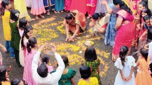 नवरात्री निमित्त सर्व परिसर भोंडल्याने,रासगरब्याने दुमदुमला आहे.यात सर्व वयोगटाच्या मुलींच्या आवडत्या सणाची म्हणजे भोंडल्याची/ गरब्याची गाणी,नृत्य चालू आहेत.आपल्या संस्कृतीची ओळख आपल्या मुलांना व्हावी..या साठी सरस्वती विद्यालय,आकुर्डी पुणे ३५ मध्ये दरवर्षी विविध सण,उपक्रम यांचे आयोजन केले जातात.त्याचप्रमाणे या ही वर्षी शनिवार दिनांक२७/९/२०२५ रोजी प्रशालेत पालकांच्या उपस्थित भोंडला उत्सव साजरा केला गेला.यात शिशुवर्ग ते दहावी पर्यंतच्या विद्यार्थिनींनी सहभाग घेतला होता.प्रत्येकीच्या चेहऱ्यावर आनंद ओसंडून वहात होता.महिला पालकही या उत्साहात आनंदाने साजऱ्या झाल्या,त्यांच्यासोबत प्रशालेतील विद्यार्थिनी,महिला शिक्षिका यांनीही आनंद घेतला.