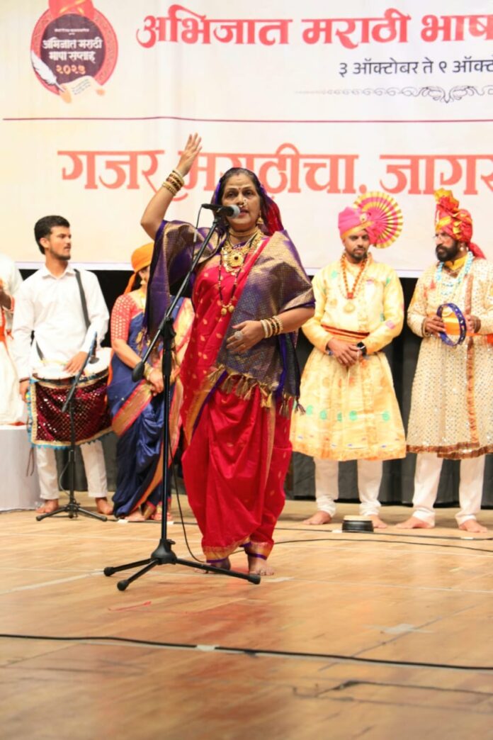 अभिजात मराठी भाषा सप्ताहात आकुर्डी प्राधिकरण येथील ग. दि. माडगूळकर नाट्यगृहात सादर झालेला ‘गजर मराठीचा, जागर शाहिरीचा’ हा कार्यक्रम लोककला आणि मराठी अभिमानाचा अद्भुत संगम ठरला. या कार्यक्रमात सादर झालेल्या शाहिरी कलाकृतींनी मराठी भाषेचा गजर आसमंतात दुमदुमवला. कार्यक्रमाची सुरुवात पारंपरिक गणगायनाने झाली. त्यानंतर ‘माझ्या जिजाऊची पुण्याई’, ‘चमके शिवबाची तलवार’ अशा विविध पोवाड्यांनी सभागृहात उत्साह आणि जोश चेतवला. छत्रपती शिवाजी महाराज आणि छत्रपती संभाजी महाराज यांच्या गौरवगाथेवरील नाट्यमय सादरीकरणाने प्रेक्षक मंत्रमुग्ध झाले. या कार्यक्रमात शाहीर प्रकाश ढवळे, अशोक कामटे, चैतन्य काजोळकर, वनिता मोहिते, नमन कांबळे, गुरुराज कुंभार तसेच वादक उद्धव गुरव (ढोलकी), वैभव गोरखे (संबळ), सुहास माळी (तुतारी), ईशा बांदिवडेकर, कस्तुरी चंद्रडकर, शाल्मली जोशी, नीना देशपांडे, चित्रा कुलकर्णी यांनी सहभाग घेतला. या सर्व कलाकारांनी केलेल्या दमदार सादरीकरणाने कार्यक्रमाला रंगत आणली.