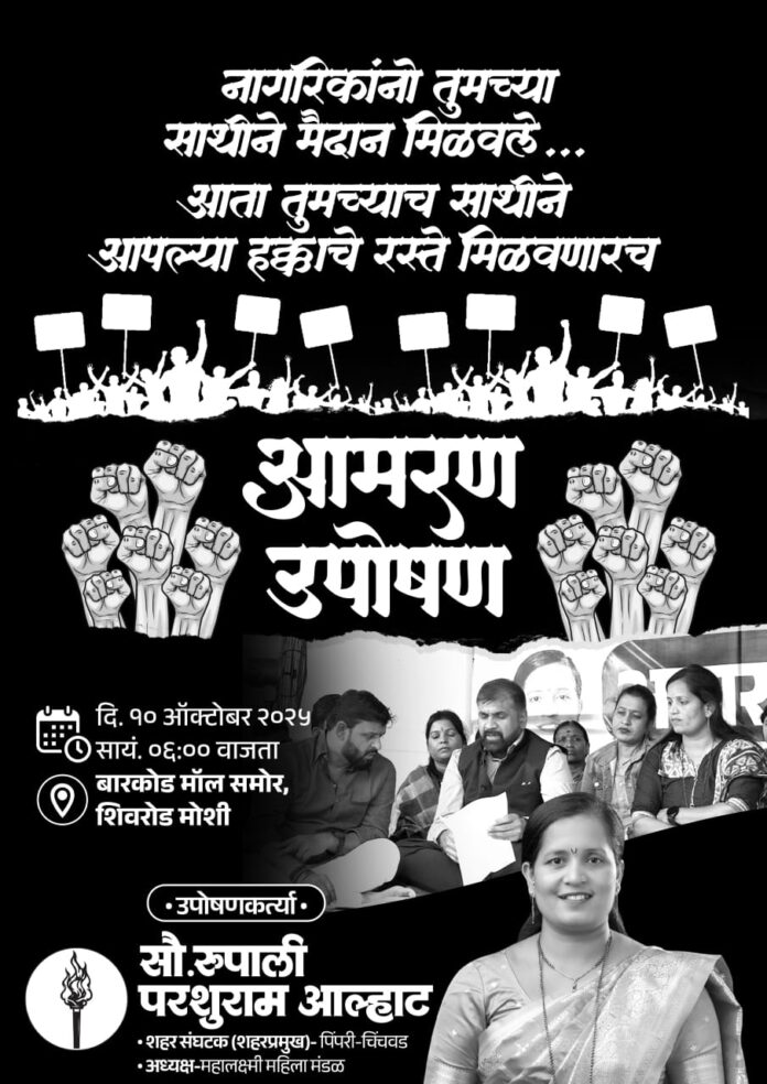 पिंपरी चिंचवड शहरातील शिवसेना उद्धव बाळासाहेब ठाकरे पक्षाच्या शहर संघटिका सौ रुपाली अल्हाट विविध मागण्यांसाठी अमरण उपोषण करणार आहेत. पिंपरी चिंचवड शहरातील जाधववाडी, मोशी, भोसरी या परिसरात अनेक वर्षापासून रस्त्यांची मागणी होत आहे. या मागणी करिता रूपालीताई आल्हाट या अमरण उपोषण करत आहेत 10 ऑक्टोबर रोजी सायंकाळी सहा वाजता बारकोड मॉल समोर, शिवरोड मोशी येथे उपोषण करणार असल्याची माहिती रूपाली अल्हाट यांच्यावतीने देण्यात आली तसेच या आमरण उपोषण आंदोलनाच्या प्रमुख मागण्या 1) वूड्सविले फेज-१ समोरील १८ मीटर DP रस्ता करण्याबाबत.